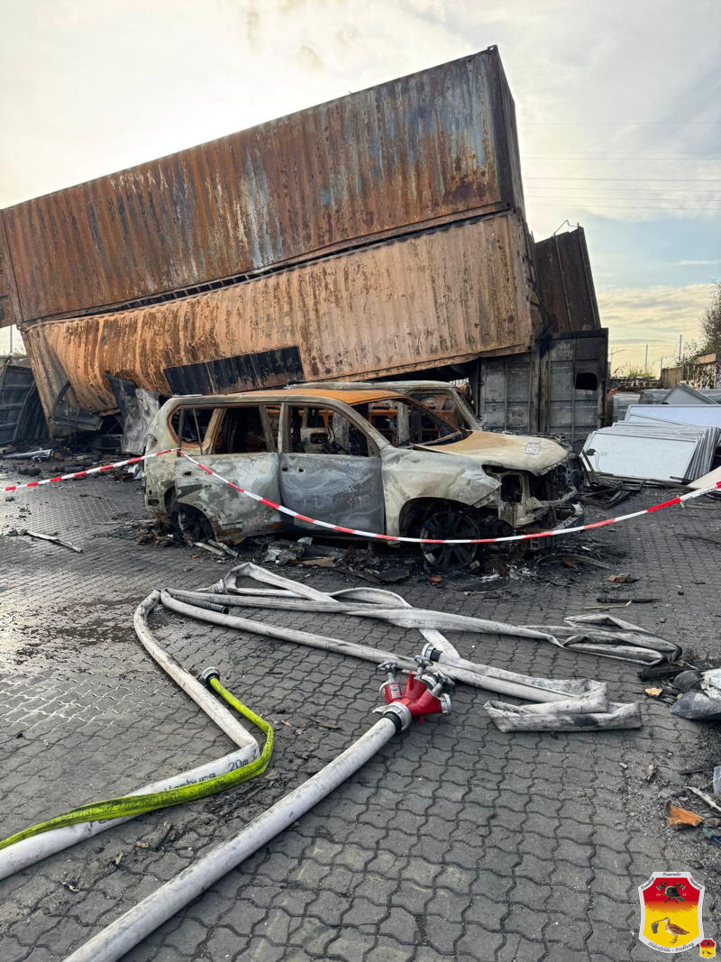Bereits am Montag, den 25.08. wurde ein brennender PKW in einer Lagerhalle gemeldet, schließlich wurde aus einem Fahrzeugbrand ein großes Feuer mit mehreren Explosionen. Durch die Explosionen flogen Trümmerteile mehrere hundert Meter weit und setzte umliegende Gebäude und Flächen in Brand.